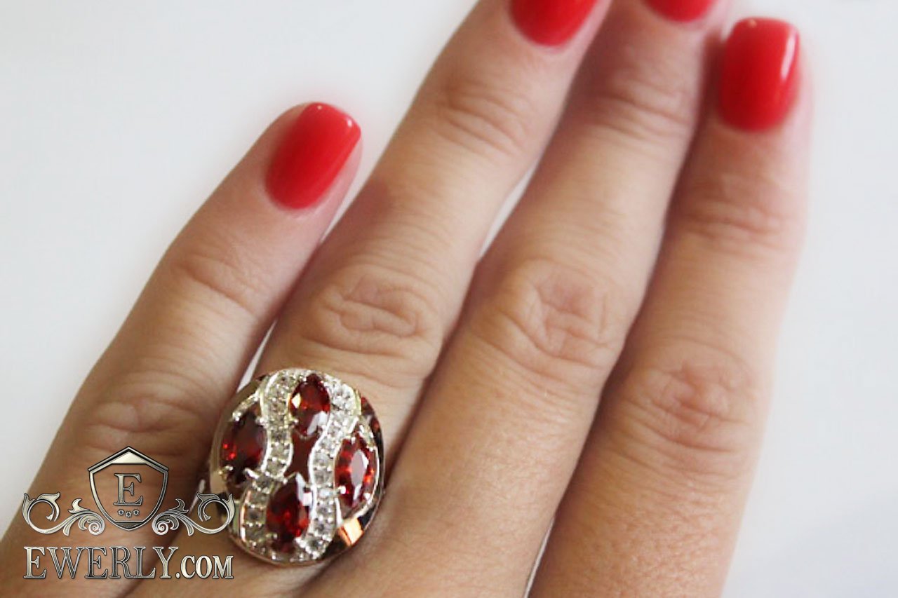 Женское кольцо из серебра с гранатовыми фианитами