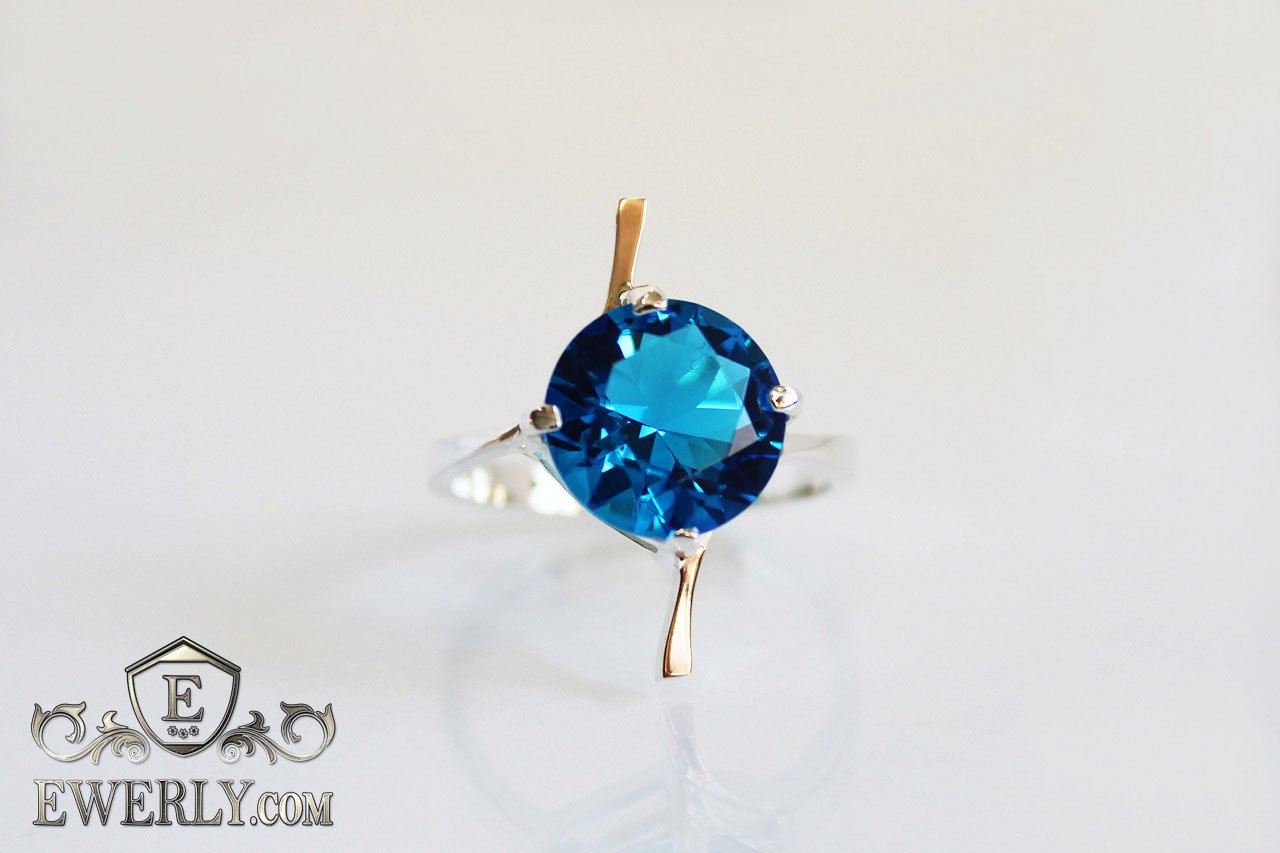 Женское серебряное кольцо 925 пробы с золотыми пластинами 375 пробы с фианитом (синий цвет).