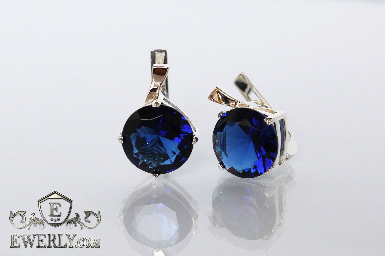 Жіночі срібні сережки з синіми фіанитами і золотом